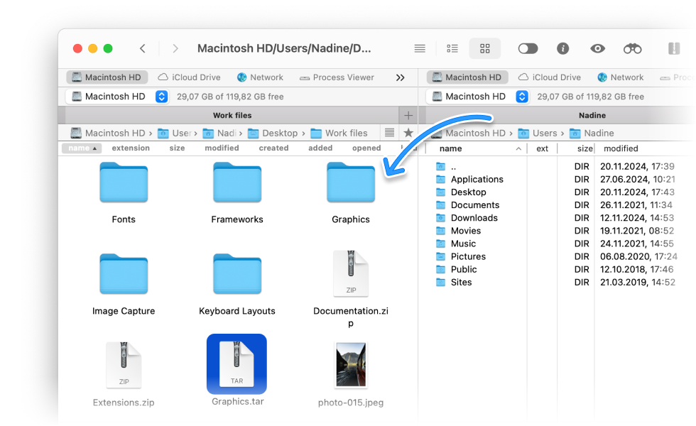 Extract TAR archives on your Mac effortlessly with Commander One! This intuitive file manager lets you handle TAR files like regular folders – extract, preview, and search files directly within the archive, all without unpacking.